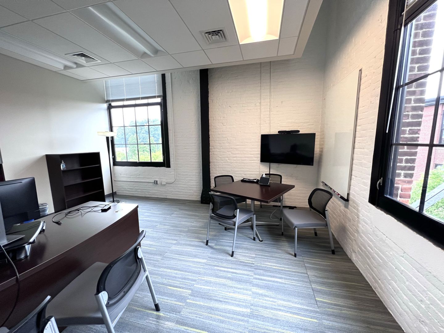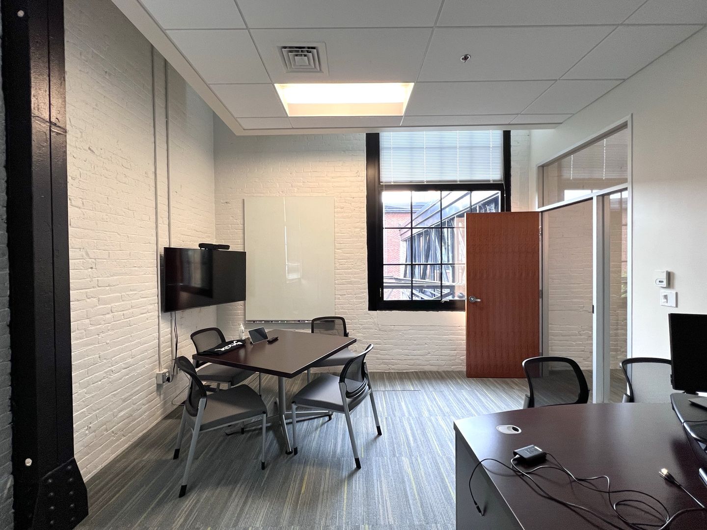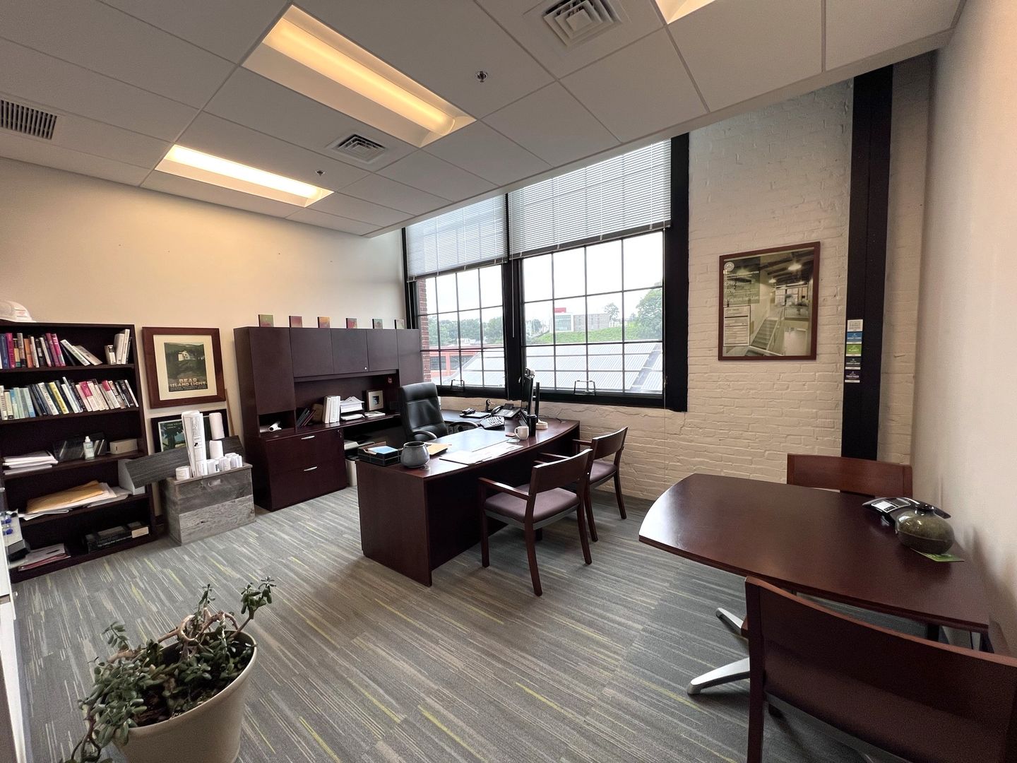 The tour shows the suite both furnished and vacant, illustrating the scale, layout, and flexibility of the space. Oversized operable windows, high ceilings, and expansive courtyard and river views create a bright, professional work environment.